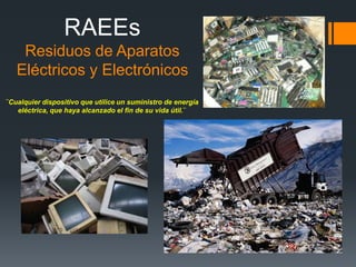 Este documento presenta información sobre la gestión de residuos de aparatos eléctricos y electrónicos (RAEEs) en el Distrito "O2". Explica que los RAEEs son dispositivos eléctricos que han alcanzado el fin de su vida útil y contienen materiales contaminantes como mercurio y plomo. También describe el proceso de recolección y tratamiento de RAEEs involucrando a la comuna, empresas privadas y una ONG. El objetivo final es concientizar a la población sobre los riesgos de la contaminación