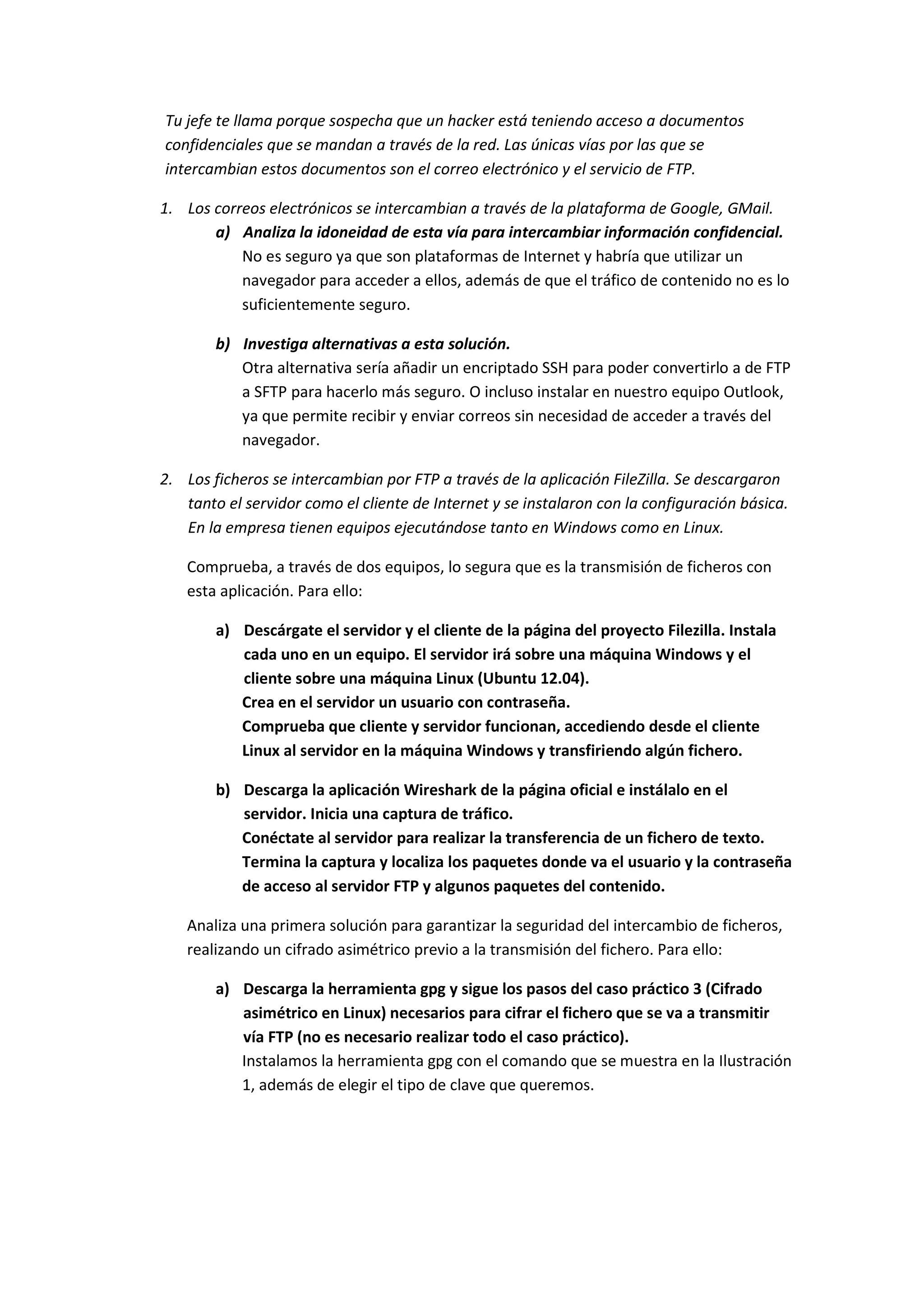 Tu jefe sospecha que un hacker está accediendo a documentos confidenciales enviados por correo electrónico y FTP. El correo electrónico usa Gmail, que no es seguro, y FTP usa FileZilla sin encriptación. Se recomienda usar SFTP o Outlook para correo y encriptar archivos con GPG antes de enviarlos por FTP para protegerlos. Luego, tu jefe es chantajeado por fotos suyas en Apple, debido a que sus redes sociales revelan información de sus preguntas de seguridad de Apple.