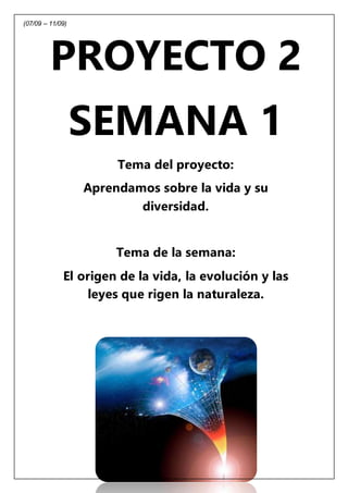 Este documento presenta el proyecto número 2 de la semana 1. El tema general del proyecto es "Aprendamos sobre la vida y su diversidad". El tema de la primera semana es "El origen de la vida, la evolución y las leyes que rigen la naturaleza". El estudiante se compromete a ayudar con tareas de la casa. Se pide responder preguntas sobre textos relacionados con el tema de la semana.