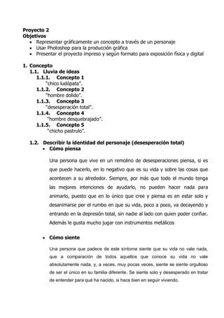 Este documento presenta un proyecto de fotomontaje de un personaje que representa el concepto de "desesperación total". El objetivo es usar Photoshop para crear gráficamente un personaje llamado Omar que sufre de problemas mentales y ha caído en la desesperación. El personaje se describe como indiferente y retraído, y el fotomontaje incluirá símbolos de desesperación como un reloj, una brújula, alambres de púas, cadenas y una jeringa en su cabeza.