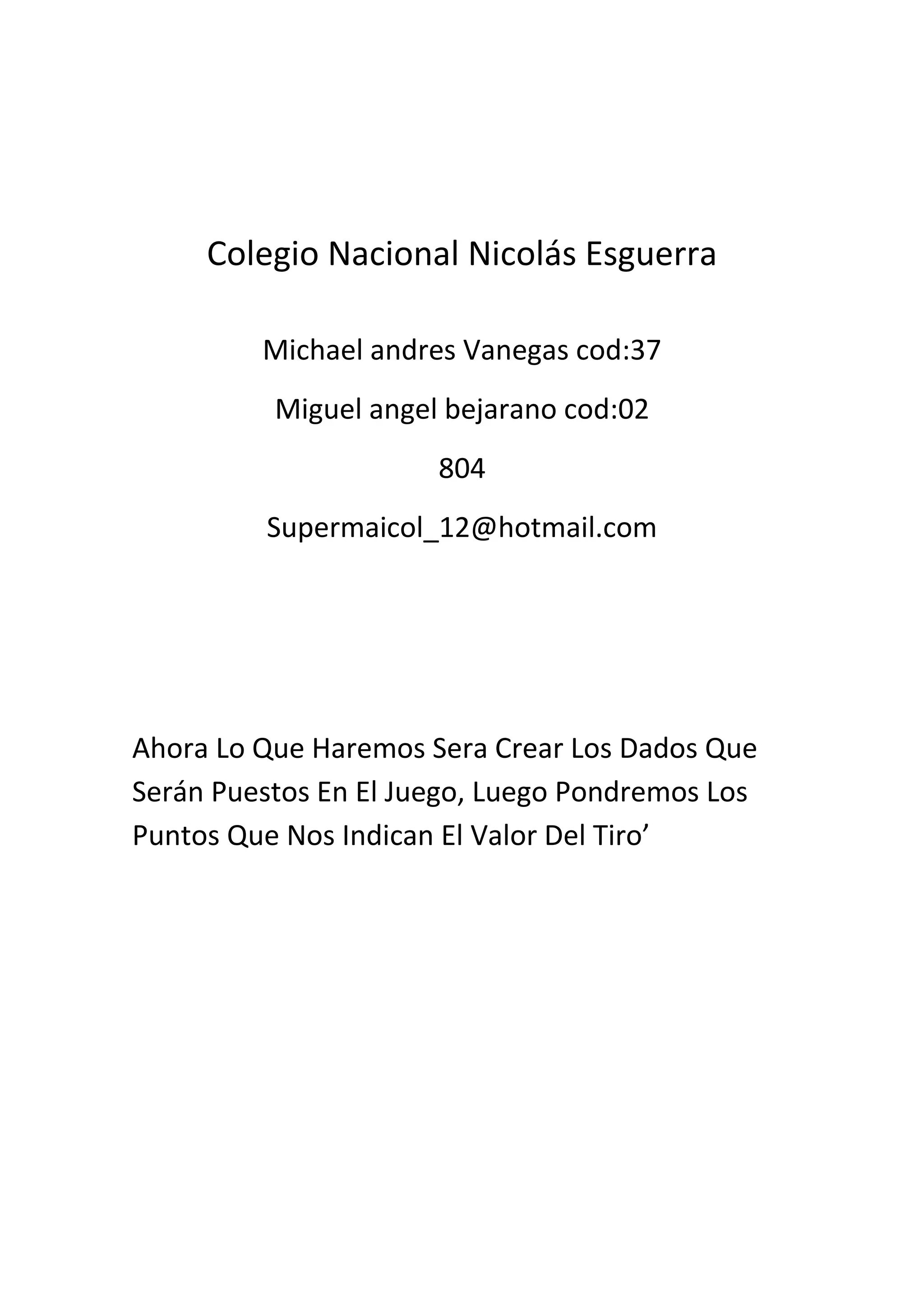 Este documento contiene información sobre dos estudiantes del Colegio Nacional Nicolás Esguerra, incluyendo sus nombres, códigos y correo electrónico. También describe los pasos iniciales para crear un juego de dados virtual, como diseñar los dados, establecer los valores de cada tiro y añadir una interfaz con un fondo y un botón para lanzar los dados.