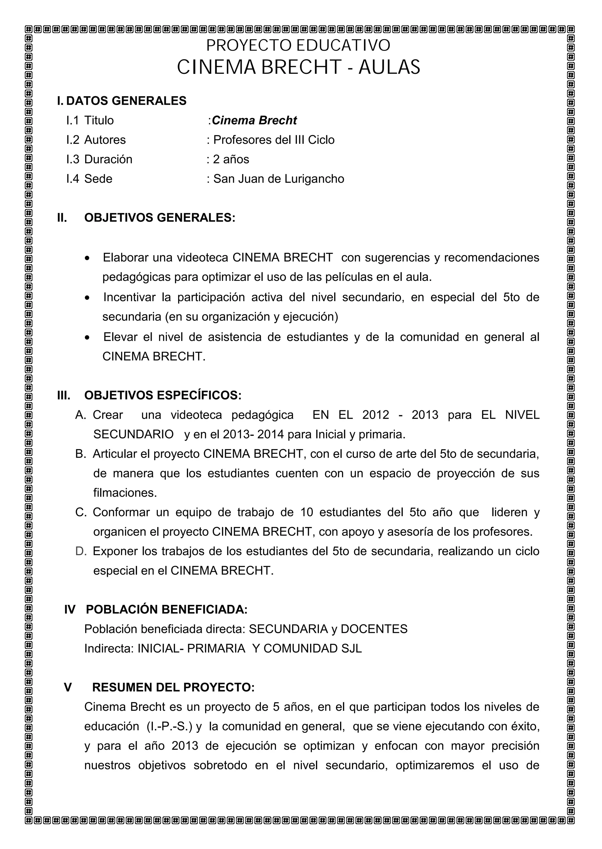 El proyecto Cinema Brecht - Aulas tiene como objetivo principal crear una videoteca pedagógica para optimizar el uso de películas en el aula y elevar el nivel de asistencia a las proyecciones de Cinema Brecht. Se busca involucrar activamente a los estudiantes de secundaria, especialmente de quinto año, en la organización de las proyecciones para promover valores ciudadanos. El proyecto tendrá una duración de dos años y beneficiará directamente a la población estudiantil y docente de secundaria e indirectamente a primaria