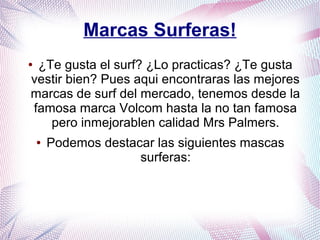 Este documento presenta varias marcas populares de ropa y equipamiento para surfistas, incluyendo DC Shoes, Volcom, y Roxy. Resalta que DC Shoes se especializa en calzado y ropa para deportes extremos como el surf y el skate, mientras que Volcom y Roxy son marcas californianas enfocadas en la moda y cultura del surf y el skate. El documento también proporciona breves historias sobre el origen y adquisiciones de cada marca.