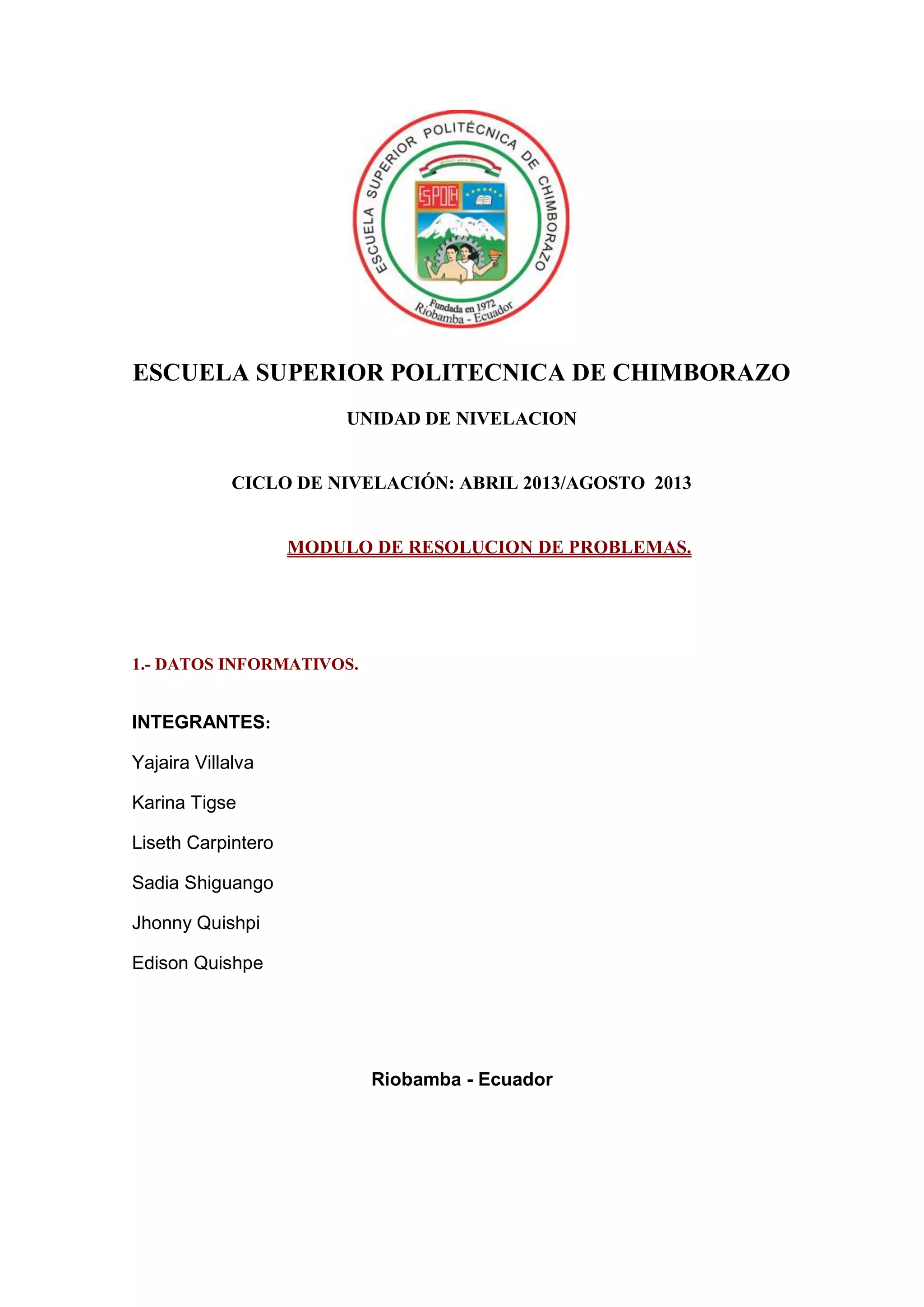 La escuela superior politécnica de Chimborazo ofrece un curso de nivelación de abril a agosto de 2013 con un módulo de resolución de problemas. El curso incluye a 6 estudiantes: Yajaira Villalva, Karina Tigse, Liseth Carpintero, Sadia Shiguango, Jhonny Quishpi y Edison Quishpe.