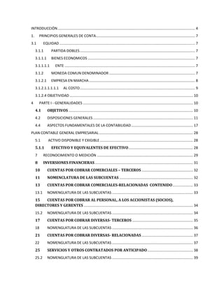 El documento presenta el nuevo Plan Contable General Empresarial de Perú, el cual reemplaza al plan anterior de 1984 para alinearlo con las Normas Internacionales de Información Financiera. El nuevo plan mantiene gran parte de la estructura y nomenclatura del plan anterior para facilitar la transición, pero introduce cambios para cumplir con las NIIF. El plan provee las cuentas contables normalizadas que deben usarse para registrar transacciones y preparar estados financieros, buscando proveer información útil para la toma de decisiones.