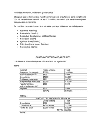 Este documento presenta un plan para establecer un centro de atención técnica a distancia llamado "GODDS" en Huatulco, México. El centro brindará soporte técnico remoto a pequeñas empresas turísticas de la región que carecen de personal técnico. El plan describe la estructura organizativa, los recursos humanos y materiales requeridos, los gastos proyectados para el primer mes y los métodos para darse a conocer y comenzar operaciones.