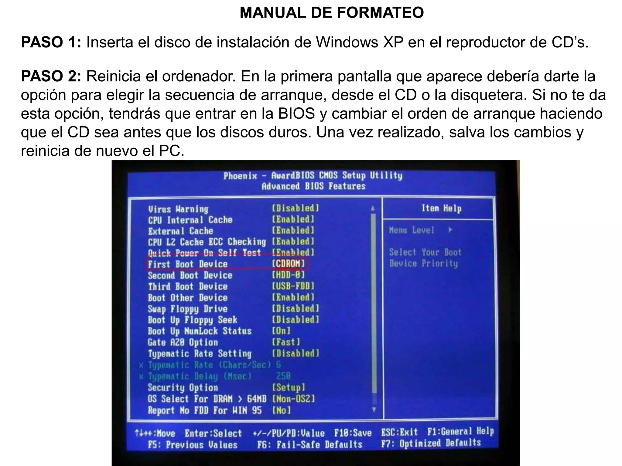 Este manual de 9 pasos describe el proceso de instalación de Windows XP en un ordenador, incluyendo reiniciar el ordenador desde el CD de instalación, eliminar particiones existentes, crear una nueva partición en el disco duro, seleccionar la partición para la instalación, formatear la partición con el sistema de archivos NTFS, e iniciar la instalación de Windows.