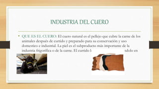El documento describe la industria del cuero. Explica que el cuero es el pellejo curtido de los animales y que la industria del cuero se remonta al Imperio Romano. También detalla el proceso de 15 pasos para transformar las pieles en cuero, incluyendo el pelambre, curtición, teñido y acabado. Finalmente, presenta la misión y visión de la empresa "Industria del Cuero" de ofrecer artículos de marroquinería de calidad a nivel nacional e internacional.