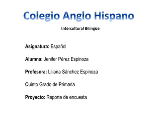 El documento presenta un resumen de un proyecto escolar sobre una encuesta realizada a 6 personas acerca de sus hábitos alimenticios y de consumo de agua. La encuesta incluyó preguntas cerradas de opción múltiple sobre la dieta, comida chatarra y frutas/verduras. Los resultados mostraron que la mayoría come frituras pero no frutas y verduras, por lo que se concluye que necesitan mejorar su alimentación.