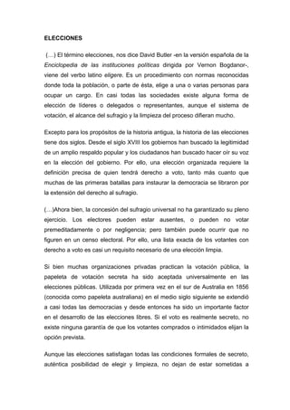 El documento discute el proceso histórico de desarrollo del sufragio universal y la democracia. Explica que el voto universal no siempre existió y fue el resultado de una larga lucha. También describe los diferentes tipos de elecciones, como las directas e indirectas, y los requisitos para que un proceso electoral sea considerado democrático y libre.