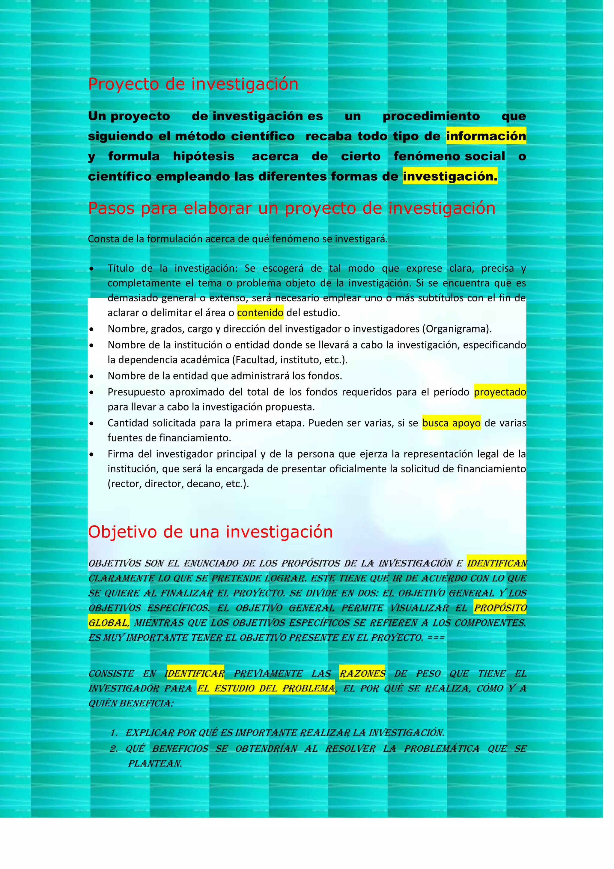 Un proyecto de investigación sigue el método científico para recopilar información y formular hipótesis sobre un fenómeno. Un proyecto de investigación incluye un título, objetivos generales y específicos, presupuesto, e importancia y beneficios de la investigación. La evaluación de proyectos mide el cumplimiento de objetivos y el impacto de un proyecto mediante un proceso objetivo, válido, confiable, oportuno y útil.