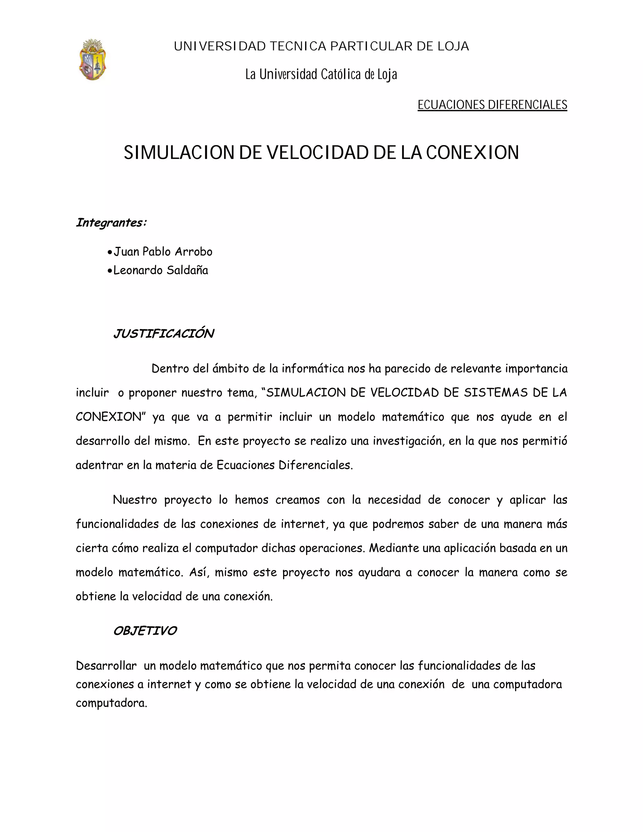Este documento presenta un proyecto para desarrollar un modelo matemático que simule la velocidad de conexión a Internet. El proyecto fue realizado por dos estudiantes y busca conocer cómo se obtiene la velocidad de una conexión mediante ecuaciones diferenciales. Se proponen dos modelos matemáticos que relacionan variables como la velocidad del modem, la constante de conexión y la velocidad de navegación. El objetivo es predecir la velocidad de conexión basándose en estos modelos.