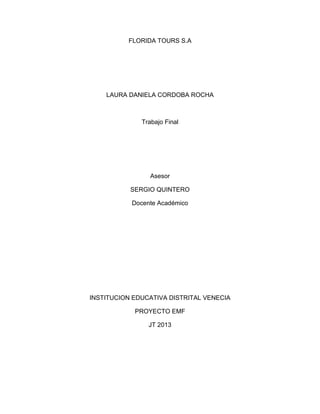 Este documento presenta un proyecto de investigación sobre el desarrollo turístico en Bogotá, Colombia. Incluye una introducción sobre la importancia creciente del turismo y una pregunta problema sobre cómo satisfacer la necesidad de las personas por el descanso y la recreación. Los objetivos son analizar los efectos del desarrollo turístico e identificar elementos clave en noticias relacionadas desde la perspectiva del turismo social. El marco teórico discute los impactos ambientales y socioeconómicos del turismo y la importancia de la planific