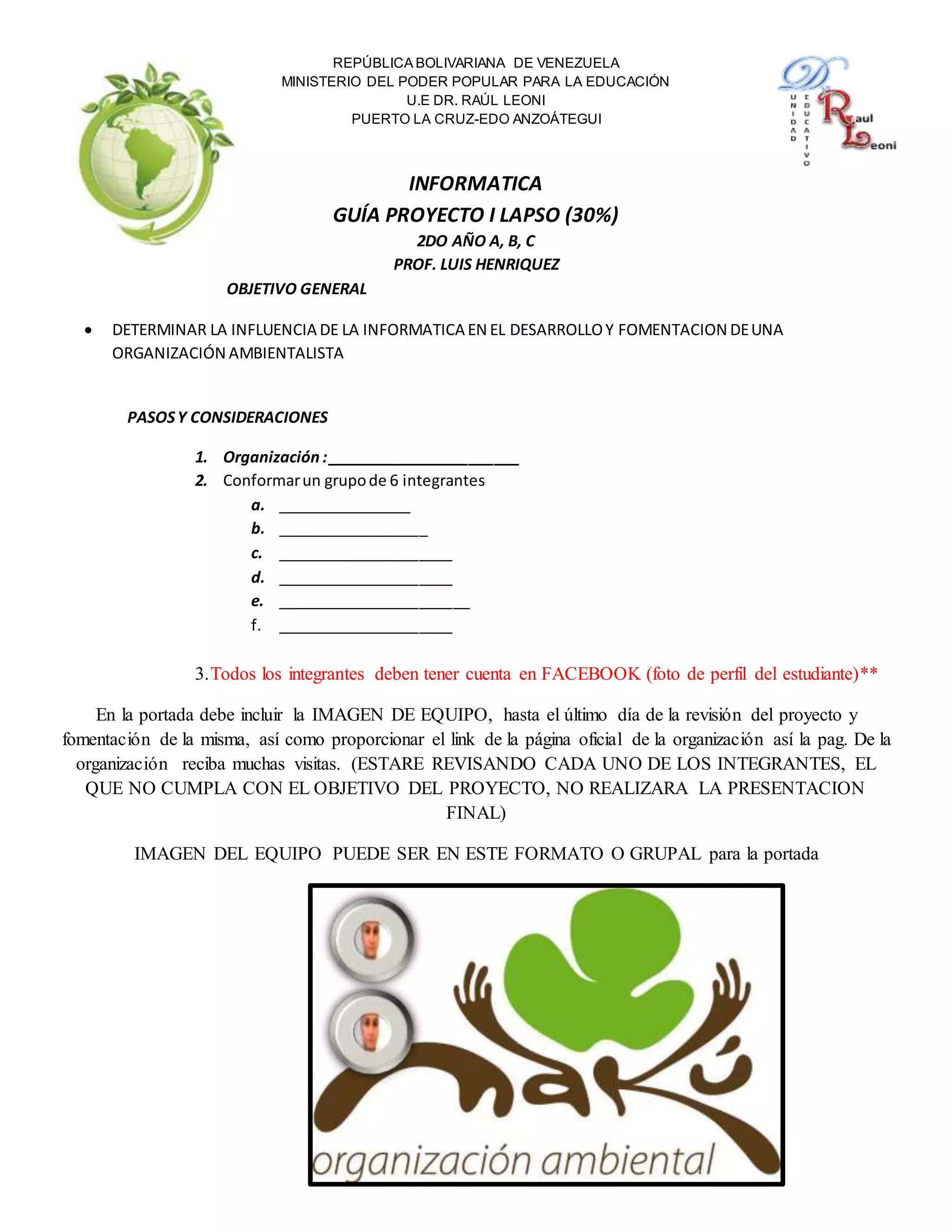 Este documento presenta las instrucciones para un proyecto escolar sobre el uso de la tecnología para promover una organización ambientalista. Los estudiantes se dividirán en grupos de 6 integrantes para crear una página de Facebook y una cuenta de correo electrónico que promuevan una organización ambiental seleccionada. Los estudiantes deberán crear una presentación en PowerPoint con información sobre la historia, objetivos, visión y trabajos de la organización, así como enlaces a sus redes sociales. Tres estudiantes coordinarán el proyecto y