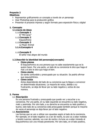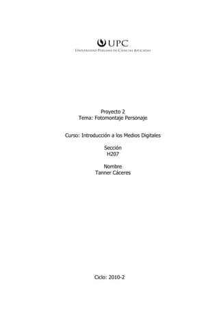Este documento presenta el proyecto 2 de fotomontaje de un personaje para el curso Introducción a los Medios Digitales. El estudiante Tanner Cáceres explorará el concepto de la esquizofrenia a través de la creación de un personaje que represente los lados positivo y negativo de la conciencia. El proyecto involucra la generación de ideas, la descripción del personaje, el desarrollo de su forma y composición visual, y la producción final en Photoshop.