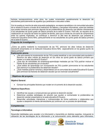 Este documento presenta un proyecto pedagógico sobre la deserción escolar en un colegio rural. El proyecto busca identificar las causas de la deserción y desarrollar estrategias mediadas por las TIC para motivar a los estudiantes. El proyecto se llevará a cabo con estudiantes de quinto grado y durará dos meses. Se espera conocer las causas de deserción en la comunidad y desarrollar actividades colaborativas usando las TIC para aumentar el interés de los estudiantes por continuar sus estudios