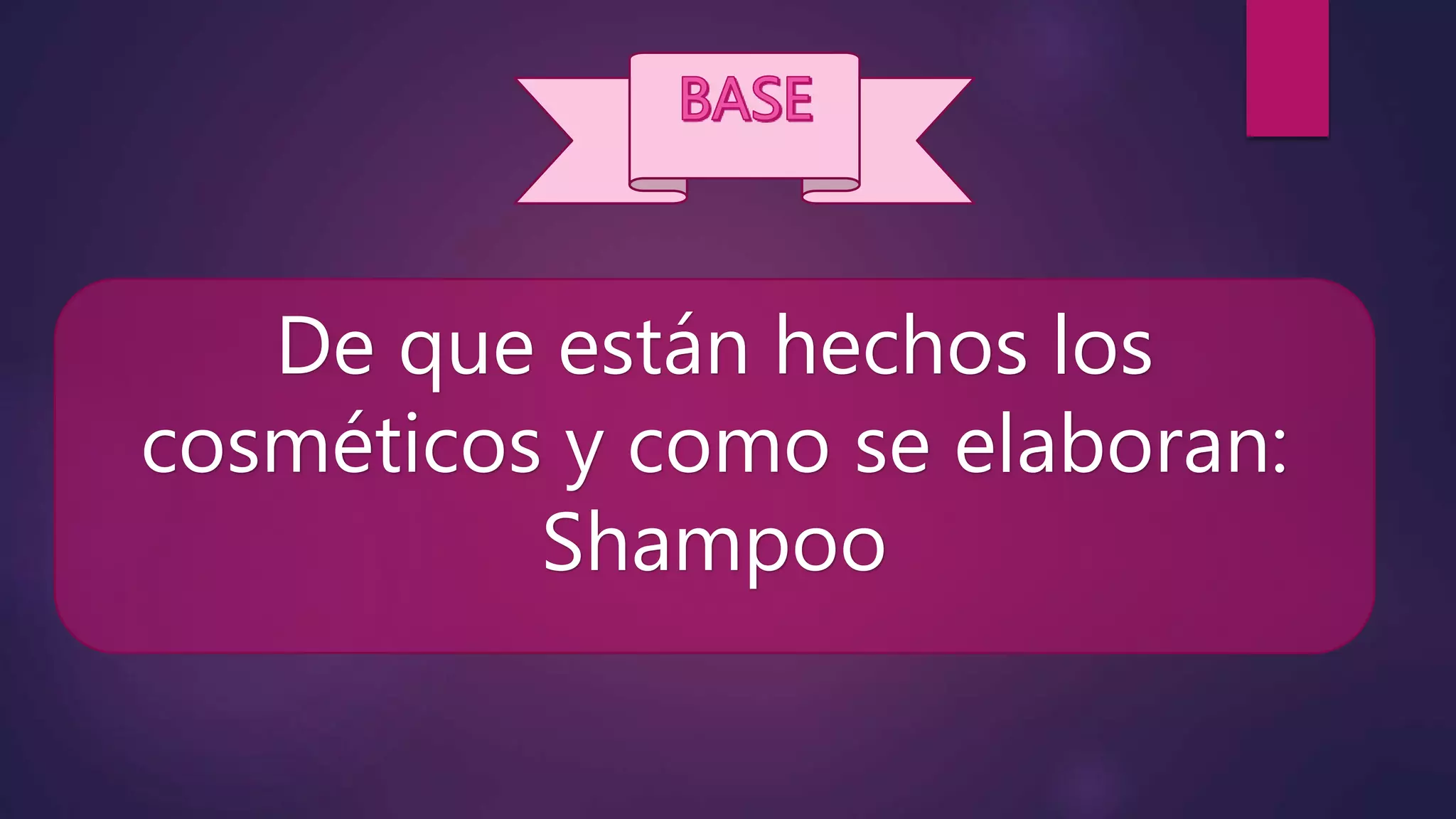 El documento describe los principales ingredientes utilizados en los champús y sus propiedades. La pulpa de sábila y el aceite de argán nutren el cabello y lo hacen más suave y brillante, mientras que el cloruro de guar-hidroxipropiltrimonio ayuda a evitar los enredos. El sulfato de sodio y de amonio limpian el cabello pero también pueden dañarlo, y la cocamida DEA y la cocamidopropil betaina ayudan a producir espuma y reducir la irritación.