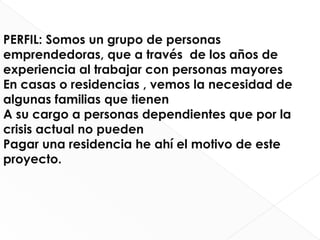 Este proyecto propone crear una empresa de teleasistencia a domicilio para personas con minusvalía. La empresa brindaría servicios de asistencia las 24 horas para cubrir las necesidades de familias que no pueden pagar una residencia debido a la crisis. El proyecto detalla los pasos para obtener la autorización de apertura de la empresa por parte de la Consejería de Familia y Asuntos Sociales de la Comunidad de Madrid.