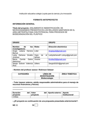 Este documento presenta un proyecto de investigación cuyo objetivo es aislar e identificar microorganismos en rellenos sanitarios del valle de Aburrá con potencial para biodegradar plástico. El plástico tarda más de 100 años en degradarse y contamina el ambiente. El proyecto busca encontrar microbios que aceleren su biodegradación mediante el aislamiento de cepas de los rellenos y pruebas de su capacidad de degradación de plástico a escala de laboratorio. De lograrse, esto podría