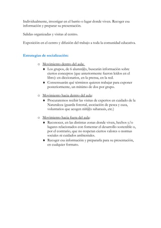 El documento describe un proyecto escolar sobre el medio ambiente y el desarrollo sostenible. Los estudiantes investigarán cómo era, es y será el planeta a través de una exposición y guía. Realizarán lecturas, visitas y entrevistas para recopilar información sobre su entorno natural y social. Organizarán el material recopilado y lo presentarán de forma visual para concienciar sobre la importancia de cuidar el medio ambiente.
