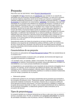 El documento define un proyecto como un conjunto de actividades planificadas y coordinadas para alcanzar objetivos específicos dentro de límites de presupuesto y tiempo. Explica que la gestión de proyectos aplica conocimientos y herramientas para satisfacer los requisitos del proyecto. Además, describe las características, tipos, etapas y documentación de un proyecto, así como los criterios y tipos de evaluación de proyectos.