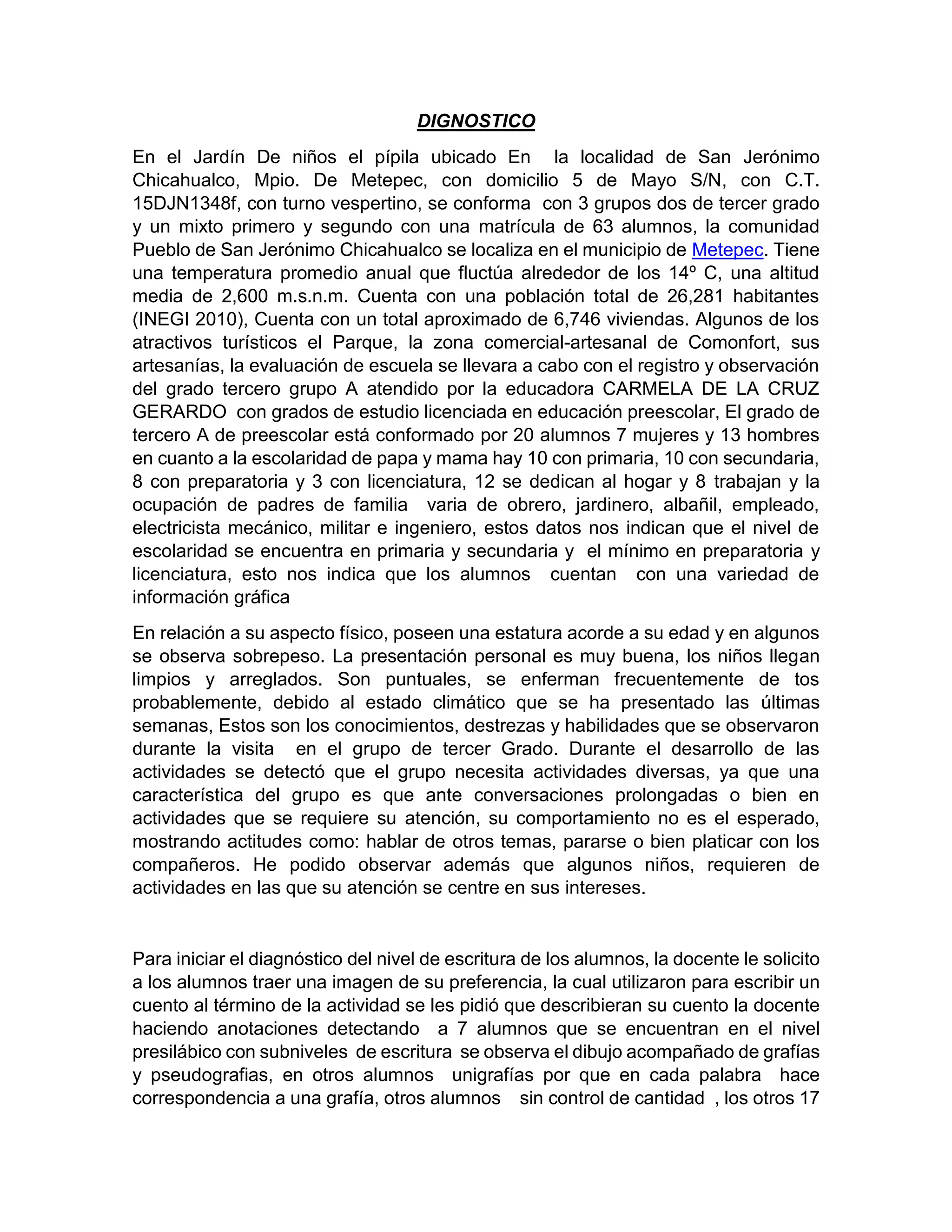 Este documento presenta un resumen del diagnóstico educativo realizado en un jardín de niños en San Jerónimo Chicahualco, México. El jardín atiende a 63 estudiantes de primero a tercer grado. La mayoría de los padres tienen educación primaria o secundaria y se dedican a oficios como obreros o albañiles. Durante las observaciones, se detectó que el grupo necesita más actividades diversas para mantener su atención. También se evaluó el nivel de escritura de los estudiantes, encontrando que