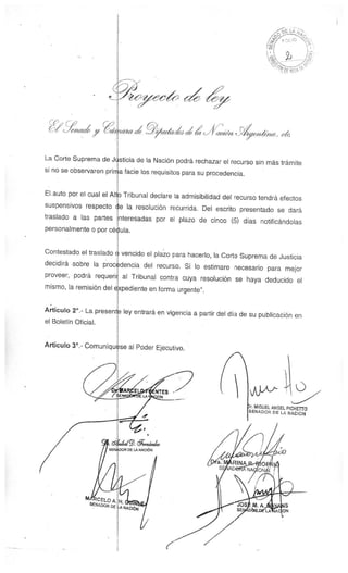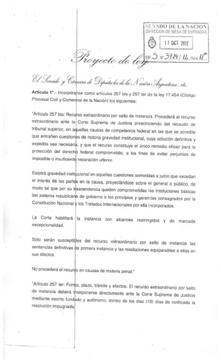 El proyecto de ley para reglamentar el per saltum menciona como requisito una situación de gravedad institucional y que haya sentencia en primera instancia o medidas cautelares que produzcan la interrupción del proceso o lo demore indefinidamente. El per saltum es un recurso jurídico que permite a la Corte Suprema proceder en las causas de competencia federal de "gravedad institucional", soslayando las instancias anteriores. Aquí el proyecto completo