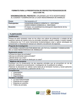 Este proyecto pedagógico busca incentivar el cuidado y disminución de la caza indiscriminada de animales en niños de transición a 5° grado a través del uso de las TIC durante 6 meses. El proyecto justifica la necesidad de crear una cultura de protección de especies nativas y utilizará estrategias como videos, charlas y salidas de campo para generar conciencia sobre especies en extinción y la caza ilegal. Se evaluará el compromiso, responsabilidad y actitudes de los estudiantes.