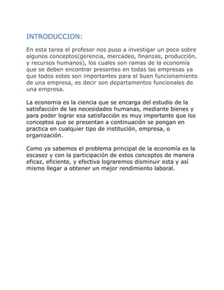 Este documento presenta una introducción a cinco conceptos clave para el funcionamiento de una empresa: gerencia, mercadeo, finanzas, producción y recursos humanos. Explica brevemente cada concepto y provee enlaces bibliográficos para obtener más información. El propósito es investigar estos conceptos funcionales que son importantes para el éxito de cualquier organización.