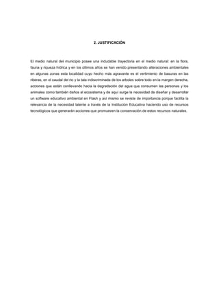 El documento trata sobre la creación de un software educativo ambiental para estudiantes de primaria. El software tiene el objetivo de instruir a los estudiantes sobre el comportamiento ambiental adecuado y la importancia de conservar los recursos naturales de la región, debido a que actualmente existe mal uso de desechos, tala de árboles y caza indiscriminada. El software se desarrollará en Flash y se aplicará en la sala de informática de la institución educativa para formar una cultura de preservación ambiental entre los estudiantes.