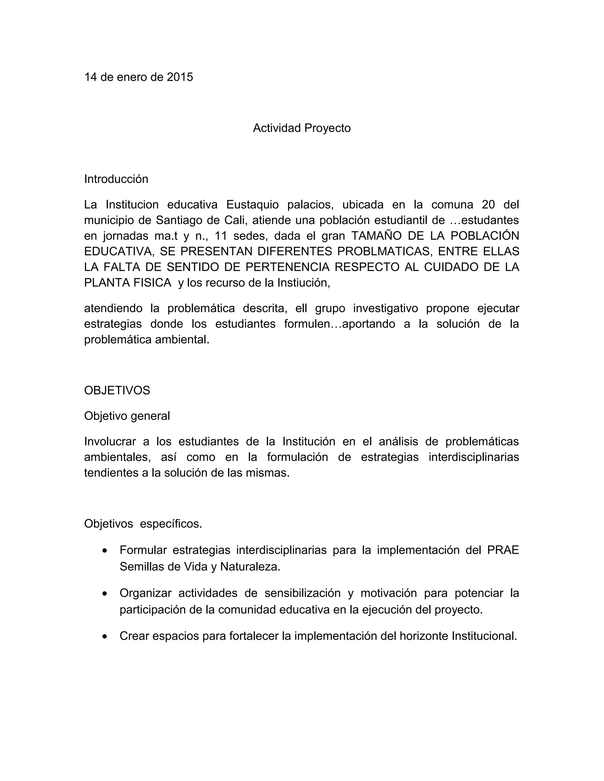 El documento presenta un proyecto de la Institución Educativa Eustaquio Palacios para involucrar a los estudiantes en la solución de problemas ambientales de la escuela. El proyecto busca formular estrategias interdisciplinarias que promuevan la participación de la comunidad educativa en la ejecución del proyecto "Semillas de Vida y Naturaleza" para fortalecer el cuidado de las instalaciones y recursos de la institución.