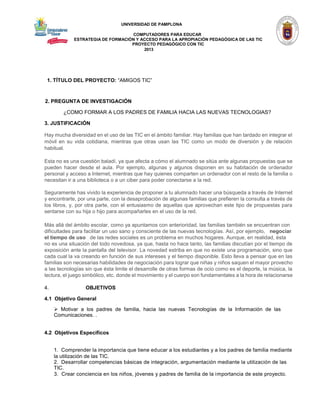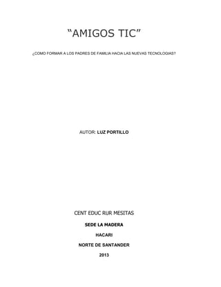 El documento presenta el proyecto "amigos tic", que busca formar a los padres de familia en el uso de nuevas tecnologías para mejorar la educación de sus hijos. Se justifica la necesidad de esta formación por la diversidad en el uso de TIC en las familias y sus impactos en el aprendizaje de los estudiantes. Además, se abordan los objetivos y metodologías del proyecto, destacando la importancia de integrar las TIC en el proceso educativo para fomentar competencias esenciales en los alumnos y padres.