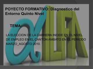 El documento analiza la relación entre la elección de carreras y el nivel de empleo en el cantón Ambato durante el período de marzo a agosto de 2010, destacando la crisis de empleo en Ecuador y la saturación de ciertas carreras. Se identifican factores como la falta de formación adecuada y orientación vocacional como causantes del desempleo. A través de encuestas a estudiantes y profesionales, se busca conocer cómo la elección de carrera influye en la situación laboral de los habitantes del cantón.