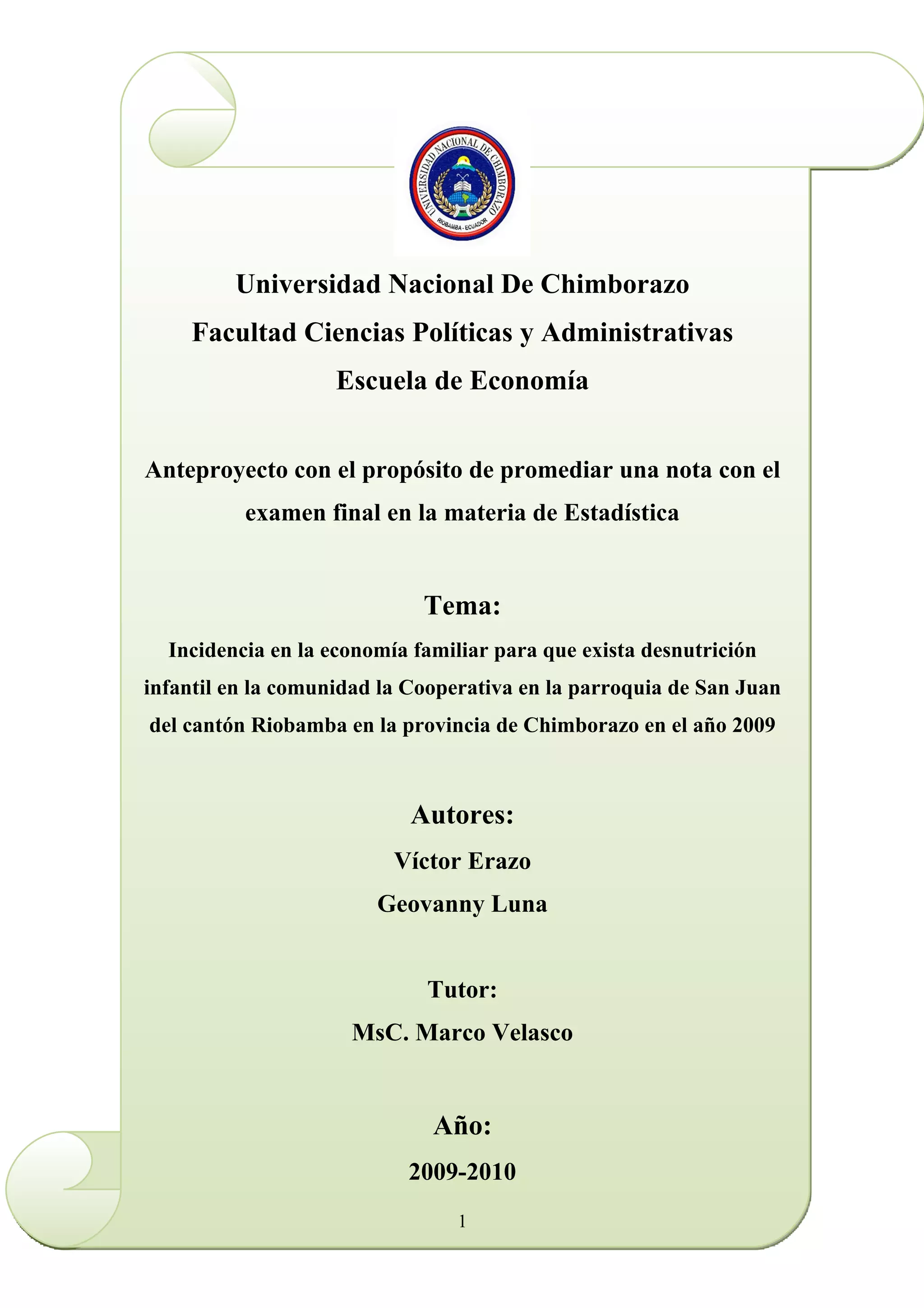 Este documento presenta un anteproyecto para investigar los problemas económicos y sociales que causan desnutrición infantil en la comunidad la Cooperativa en la parroquia de San Juan, Riobamba, Ecuador en 2009. El objetivo general es investigar cómo se formó este problema, y los objetivos específicos son identificar las causas del problema económico-social, analizar cómo afecta la desnutrición a los niños, y conocer si el gobierno brinda alguna ayuda. Se realizarán encuestas a hogares para analizar sus necesidades y si suf