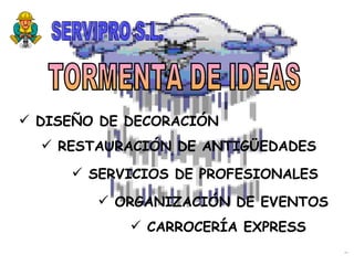 El documento presenta un plan de negocio para una empresa llamada SERVIPRO S.L. que ofrece una variedad de servicios profesionales a hogares y empresas. El plan describe el análisis del mercado, la competencia, la cartera de servicios, la estrategia de precios, publicidad y distribución, así como proyecciones financieras para los primeros 5 años.