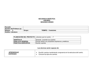 Este documento presenta una secuencia didáctica de 9 sesiones para enseñar a estudiantes de segundo grado de primaria a escribir cuentos. La secuencia incluye actividades para explorar la estructura y tipos de cuentos, escribir cuentos individuales y en equipo, y publicar los cuentos en un blog. El objetivo es que los estudiantes aprendan a escribir cuentos manteniendo la congruencia en la trama.