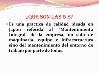 Este documento describe las 5S, una práctica de calidad japonesa para el mantenimiento integral de una empresa. Las 5S son: clasificación y descarte (Seiri), organización (Seiton), limpieza (Seiso), higiene y visualización (Seiketsu), y compromiso y disciplina (Shitsuke). El autor aplica cada una de las 5S a su casa para mejorar el orden y limpieza.