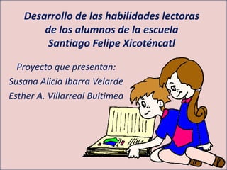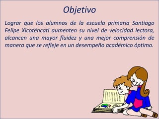 Este documento presenta un proyecto para desarrollar las habilidades lectoras de los estudiantes de la escuela primaria Santiago Felipe Xicoténcatl. El objetivo es aumentar la velocidad lectora, fluidez y comprensión de los estudiantes para mejorar su rendimiento académico. El proyecto incluye una evaluación diagnóstica inicial, análisis de los resultados, y la implementación de varias estrategias de lectura como cuentos libros, competencias de velocidad lectora y festivales literarios.