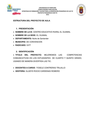 El proyecto pedagógico 'Mejoremos las competencias comunicativas en los estudiantes de cuarto y quinto grado' busca mejorar las habilidades comunicativas de los estudiantes de la sede El Guamal mediante actividades divertidas y el uso de TIC. Se identifica un problema notable en las habilidades comunicativas de los estudiantes, lo que afecta su rendimiento académico y se plantean objetivos específicos para abordar esta deficiencia. La metodología constructivista propone actividades prácticas y evaluación continua para lograr una apropiación efectiva de las TIC en el aprendizaje de los estudiantes.