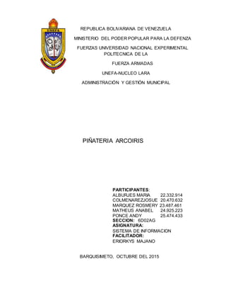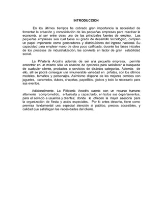 Este documento describe la Piñatería Arcoíris, una pequeña empresa dedicada a la elaboración de piñatas en Venezuela. Presenta la misión, visión y objetivos de la empresa, así como su organización interna divida en departamentos como gerencia, operaciones, calidad, planificación y tecnología. Finalmente, analiza posibles problemas y soluciones para la adquisición de materia prima, concluyendo que la mejor alternativa es solicitar cotizaciones a diferentes proveedores.