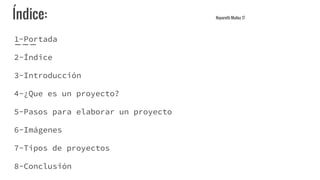 Este documento presenta un proyecto escolar sobre cómo crear proyectos. Explica que un proyecto es un conjunto de actividades interrelacionadas para alcanzar un objetivo dentro de un presupuesto. Detalla los pasos para elaborar un proyecto, incluyendo identificar tendencias, diseñar el modelo de negocio, análisis de competencia y lanzamiento al mercado. Además, presenta ejemplos de tipos de proyectos como proyectos empresariales y muestra imágenes relacionadas. En conclusión, resume que el documento explica cómo