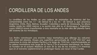 La cordillera de los Andes se extiende a lo largo de 7240 km en Sudamérica, alcanzando una altura promedio de 4000 m y conteniendo las montañas más altas fuera de Asia, como el Aconcagua. Los Andes se formaron por la subducción de placas oceánicas debajo de la placa Sudamericana y contienen actividad sísmica y volcánica. Algunas de las principales zonas volcánicas son el norte, centro y sur de los Andes.