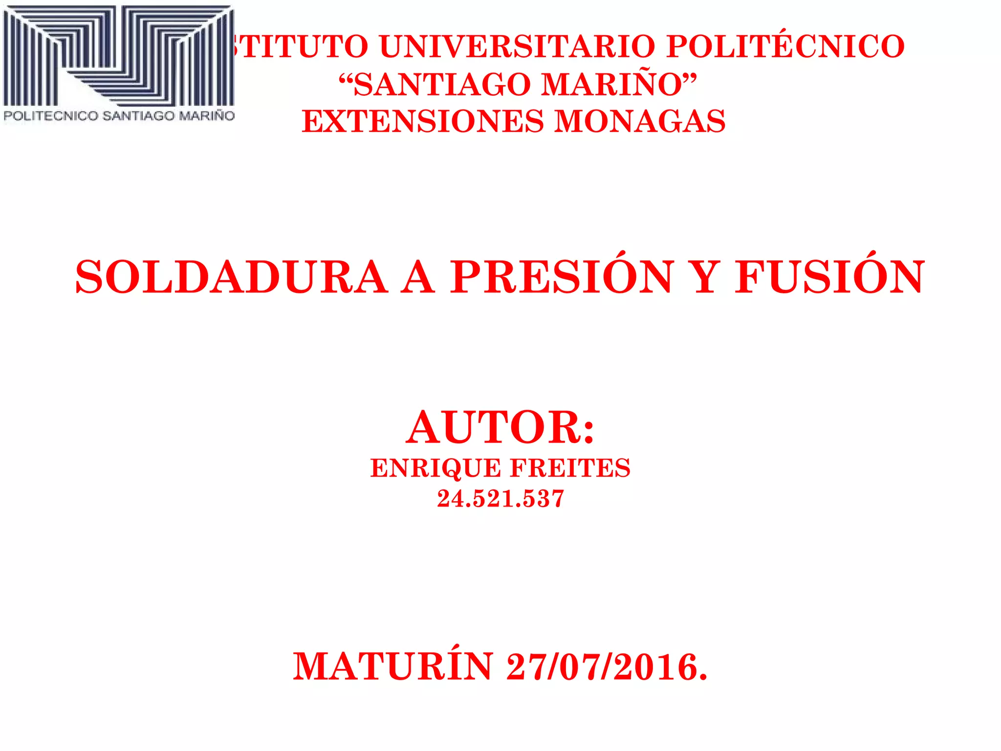 Este documento resume los procesos de soldadura a presión y fusión. La soldadura a presión involucra calentar los materiales sin fundirlos para dejarlos en estado plástico, mientras que la soldadura por fusión implica fundir dos piezas de metal hasta unirlas. Se describen las ventajas y desventajas de ambos métodos, así como los tipos de equipos utilizados para llevarlos a cabo y sus aplicaciones industriales.