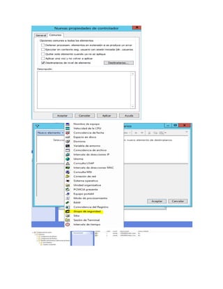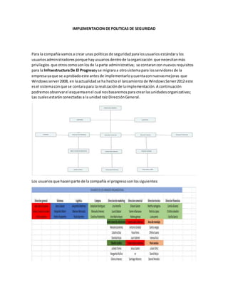 El documento describe la implementación de políticas de seguridad en la compañía, incluyendo la gestión de contraseñas y acceso a sistemas. Se detallan los procedimientos para configurar el DHCP, las políticas de usuarios y equipos, así como la creación de unidades organizativas. Además, se abordan restricciones de acceso a medios extraíbles y configuraciones de usuarios en la red corporativa.