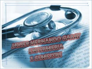 Este documento presenta la biografía, metas y cronograma de vida de Javier Hernando Garay, un estudiante de primer semestre de enfermería. Describe su visión de convertirse en un buen enfermero jefe a través del conocimiento y desempeño. También presenta brevemente su historia familiar y educativa, así como sus metas a corto, mediano y largo plazo relacionadas a su carrera y vida personal.