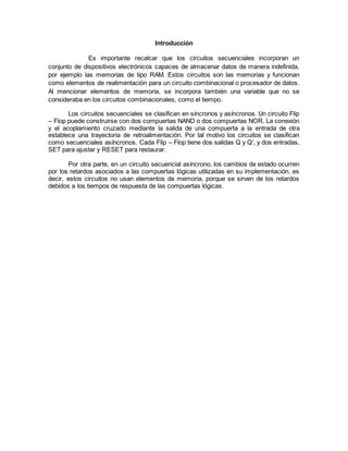 Este documento describe un proyecto de laboratorio sobre circuitos secuenciales utilizando flip-flops. El proyecto incluye objetivos como obtener las tablas de verdad de los flip-flops RS y D, estudiar su funcionamiento y observar el efecto del reloj. Se realizan actividades como implementar flip-flops básicos, estudiar su uso como divisores de frecuencia y contadores, y como pulsador start/stop. Las conclusiones indican que los flip-flops son celdas binarias capaces de almacenar información y tienen dos estados