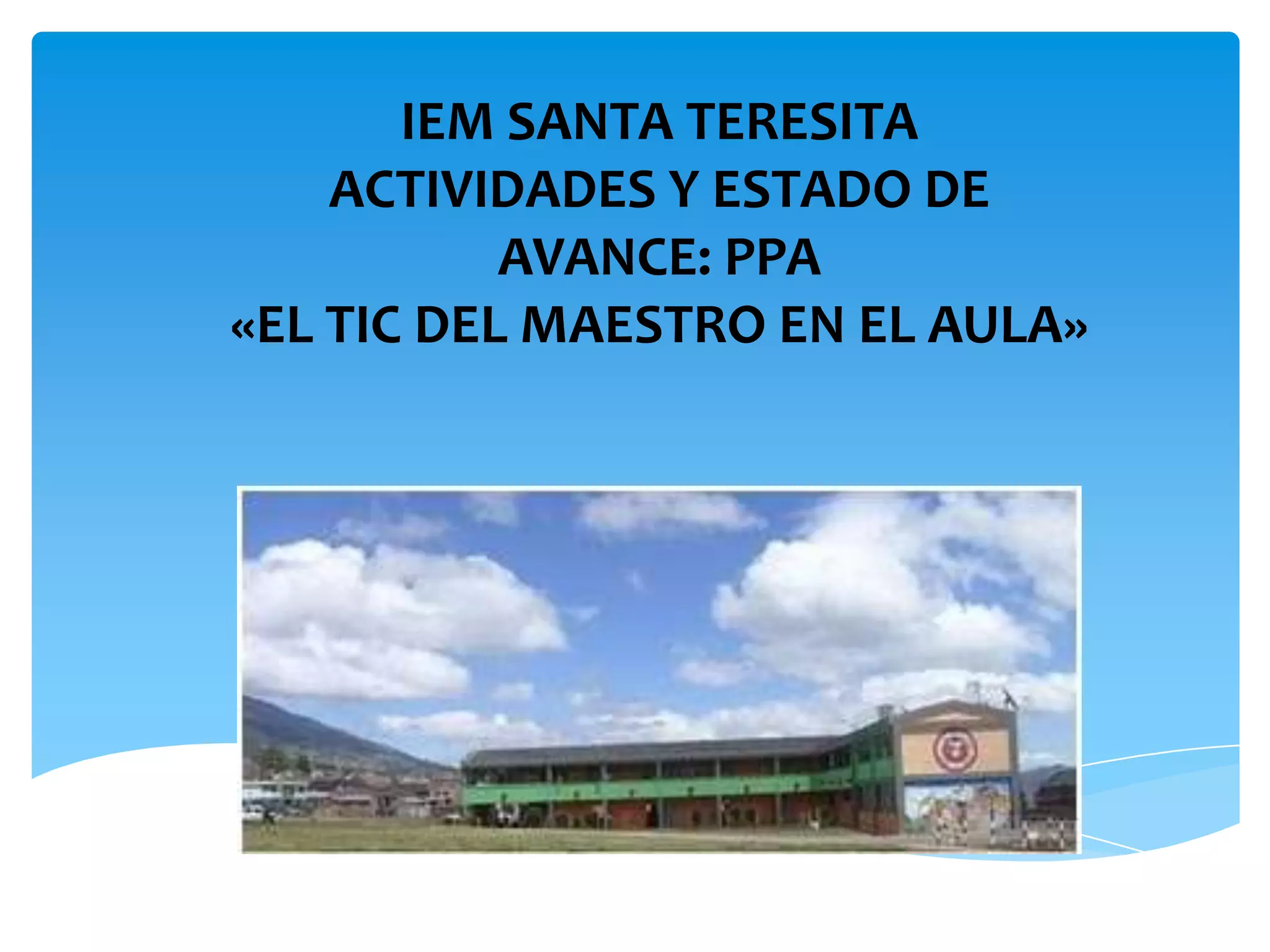 El documento resume las actividades y el estado de avance del Proyecto Pedagógico Ambiental "El TIC del maestro en el aula" de la Institución Educativa Mixta Santa Teresita. Se realizó una jornada de motivación para presentar el PPA a los docentes. También se está construyendo un blog para el PPA y se capacitó a estudiantes y docentes sobre su construcción. Finalmente, se usaron las TIC para realizar elecciones estudiantiles mediante una base de datos creada para ese fin.