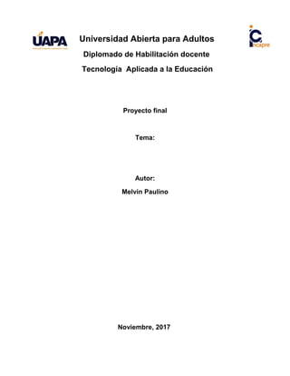 Este documento presenta un proyecto para enseñar inglés utilizando tecnología en la Escuela Genaro Pérez distrito 03 en Santiago de los Caballeros. El proyecto busca proveer materiales y herramientas tecnológicas para facilitar el aprendizaje del inglés. El proyecto seguirá un cronograma de trabajo que incluye reuniones con profesores, coordinadores y directores para diseñar y aplicar el proyecto durante el primer cuatrimestre y medir los resultados.