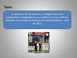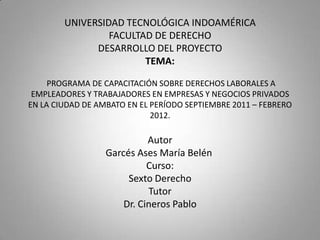 El documento presenta un proyecto de capacitación sobre derechos laborales dirigido a empleadores y trabajadores en Ambato, Ecuador, entre septiembre de 2011 y febrero de 2012. Su objetivo es analizar la aplicación de los derechos y obligaciones laborales y reducir los conflictos laborales, proporcionando formación a 60 trabajadores y 6 empleadores. Se concluye que es esencial implementar este tipo de programas para mejorar las relaciones laborales y prevenir conflictos innecesarios.