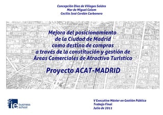 Este documento propone la creación de Áreas Comerciales de Atractivo Turístico (ACAT-MADRID) en la ciudad de Madrid para desarrollar el turismo de compras y generar riqueza y empleo. Se basa en modelos internacionales como los Business Improvement Districts. Analiza las actuaciones de promoción comercial y turística del ayuntamiento y propone adaptar el modelo a la legislación española, identificando intereses de las partes interesadas y un plan de acción para la primera zona piloto en Calle Serrano.